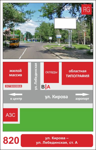 | 820 | Сумы | ул.Кирова | ул.Кирова - ул.Лебединская, в центр | A | борд 6х3 м |