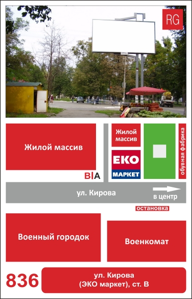 | 836 | Сумы | ул.Кирова | ул.Кирова, 165 (Экомаркет), в центр | B | борд 6х3 м |