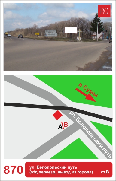 | 870 | Сумы | Выезд из города | трасса Сумы-Белополье-Конотоп-Батурин | B | борд 6х3 м |