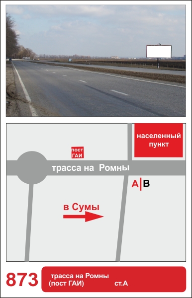 | 874 | Сумы | Выезд из города | трасса Сумы-Ромны-Киев | B | борд 6х3 м |