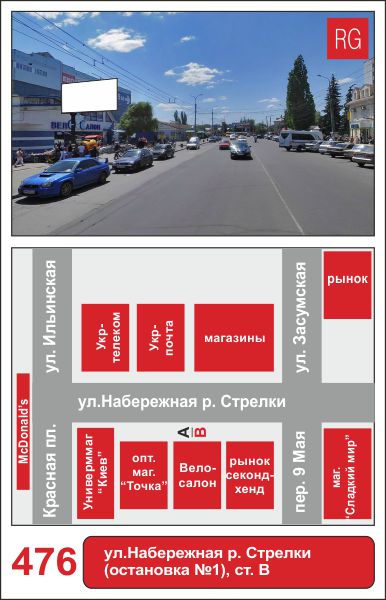 | 476 | Сумы | ул.Набережная р.Стрелки | ул.Набережная р.Стрелки (остановка 1) | B | борд 6х3 м |