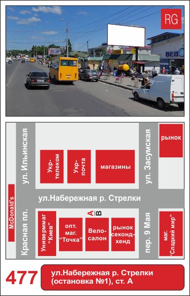| 477 | Сумы | ул.Набережная р.Стрелки | ул.Набережная р.Стрелки (остановка 1) | A | борд 6х3 м |