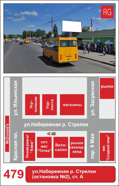 | 479 | Сумы | ул.Набережная р.Стрелки | ул.Набережная р.Стрелки (остановка 2) | A | борд 6х3 м |