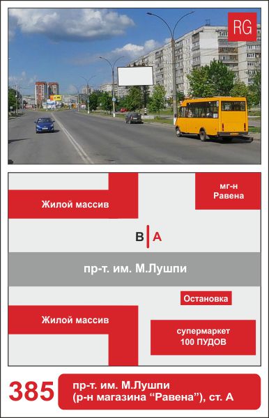 | 385 | Сумы | пр-т им. М.Лушпы | пр-т им.М.Лушпы (супермаркет Равена) | A | борд 6х3 м |