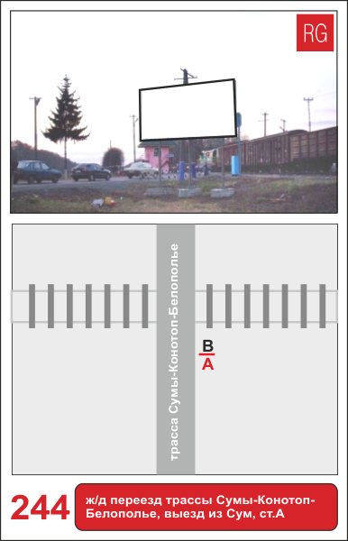 | 244 | Сумы | Выезд из города | ж/д переезд (трасса Сумы-Конотоп-Белополье, выезд из г.Сумы) | A | борд 6х3 м |
