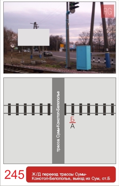 | 245 | Сумы | Въезд в город | ж/д переезд (трасса Сумы-Конотоп-Белополье, въезд в г.Сумы) | B | борд 6х3 м |