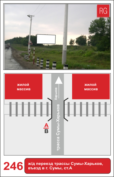 | 246 | Сумы | Въезд в город | ж/д переезд (трасса Сумы-Харьков, въезд в г.Сумы) | A | борд 6х3 м |