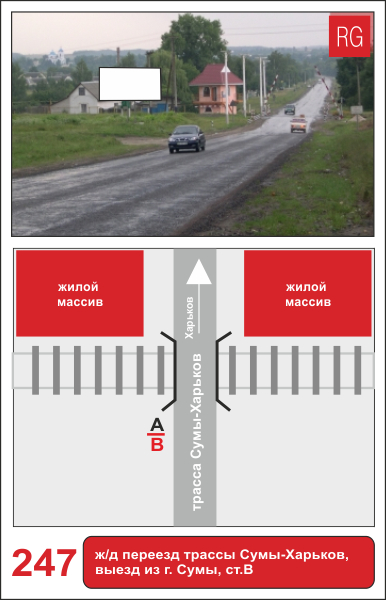 | 247 | Сумы | Выезд из города | ж/д переезд (трасса Сумы-Харьков, выезд из г.Сумы) | B | борд 6х3 м |