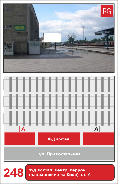 | 248 | Сумы | Ж/д вокзал; ул.Привокзальная | центр.перрон ж/д вокзала г.Сумы (перрон на Киев) | A | борд 6х3 м |