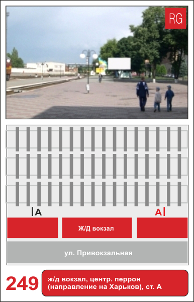 | 249 | Сумы | Ж/д вокзал; ул.Привокзальная | центр.перрон ж/д вокзала г.Сумы (перрон на Харьков) | A | борд 6х3 м |