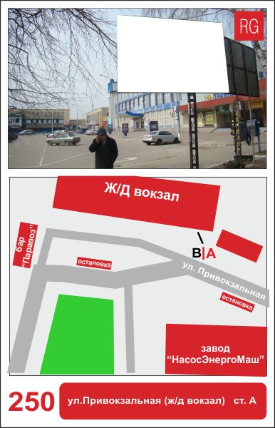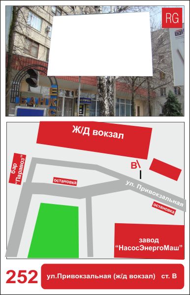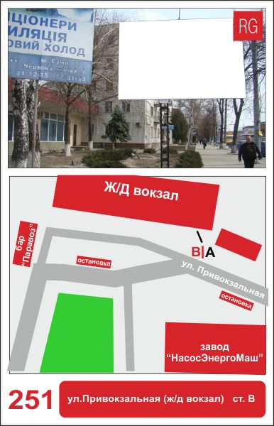 | 252 | Сумы | Ж/д вокзал; ул.Привокзальная | ул. Привокзальная, напротив пригородных касс, левая | B | борд 3х2 м |