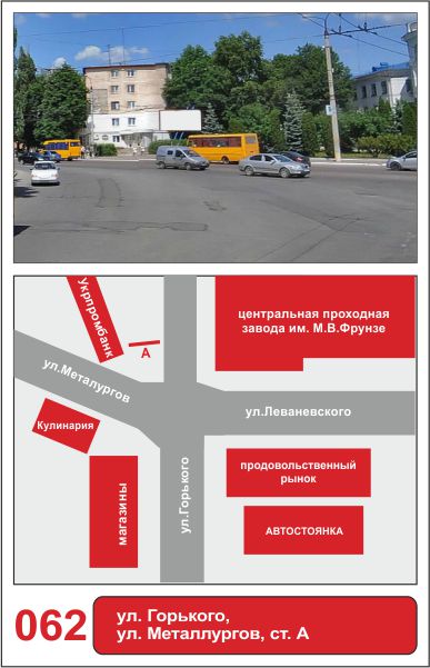 | 61 | Сумы | ул.Горького | ул.Горького - ул.Металлургов - центральная проходная НПО | A | борд 6х3 м |